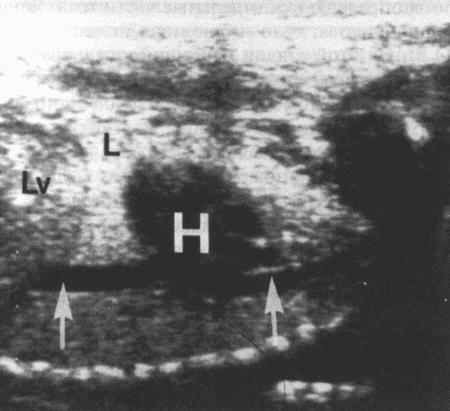 Ультразвуковое изображение грудной полости плода, демонстрирующее сердце (Н), печень (Lv), легкие (L) и крупные сосуды (стрелки). Датчик на 7,5 МГц, шкала в см