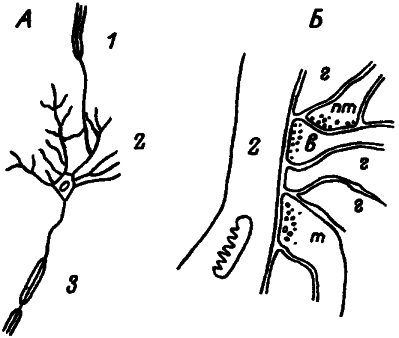 А — один синаптический контакт; Б — несколько синаптических контактов Контакты являются возбуждающими (в) и тормозными (т). На возбуждающем окончании может также заканчиваться пресинаптическое тормозное окончание (пт). Между окончаниями показаны части глиальных клеток (г). Значительная часть синапсов сосредоточена на дендритах.