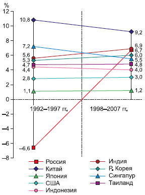 Рис. 11.12. Динамика среднего показателя прироста ВВП (%) ряда стран АТР, рассчитанная для двух периодов развития России. Источник: [Национальные счета России…, 2008, Россия и страны мира, 1996, 2000, 2002].
