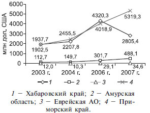 Субъекты российского Дальнего Востока – Амурская область, Еврейская автономная область, Хабаровский и Приморский края – являются теми регионами России, на которые (в силу их экономико-географического положения и структурных, ресурсных и прочих особенностей) влияние китайского фактора наиболее велико. Причем данные субъекты РФ являются одними из наиболее геополитически важных в Азиатско-Тихоокеанском регионе. Поэтому при формировании стратегий их социально-экономического, территориального развития особенно важно учитывать фактор влияния сопредельного государства – и при формировании отраслевой структуры хозяйства, и при размещении производственных, инфраструктурных объектов, и при расселении населения. Из-за географической удаленности от центральных регионов и либерализации транспортных тарифов дальневосточные территории уже около двух десятилетий существуют в условиях определенной экономической «изоляции» от Центральной России и одновременно активного экономического, гуманитарного взаимодействия с сопредельными странами. При отсутствии достаточно «весомого» собственного экономического потенциала и собственного емкого потребительского рынка в середине 1990-х гг. произошла вынужденная переориентация дальневосточных приграничных субъектов на рынки Китая и на внешние рынки Азиатско-Тихоокеанского региона в целом.