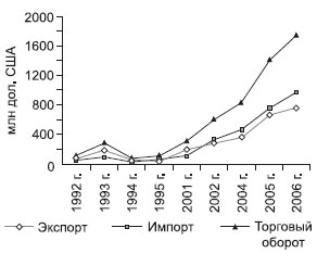 Устойчиво развиваются внешнеэкономические связи с Китаем у Еврейской автономной области. Только за 2000–2006 гг. внешнеторговый оборот ЕАО и Китая возрос более чем в 4 раза (рис. 11.17.).