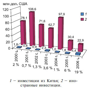 Рис. 11.15. Иностранные инвестиции в Приморский край и доля китайских инвестиций (по данным: [О внешнеэкономических связях Приморского края, 2007]).