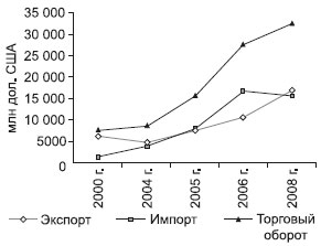 Рис. 11.17. Внешнеторговый оборот Китая и Еврейской автономной области (мл. дол. США) (по данным: [Статистический ежегодник Еврейской автономной области, 2008]).