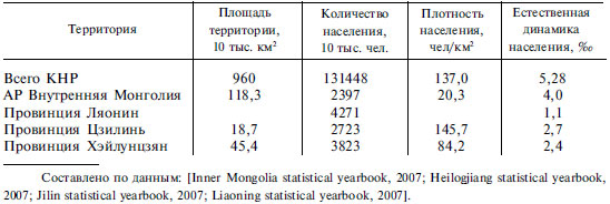 – крайне низок демографический потенциал приграничных регионов российского Дальнего Востока (на конец 2007 г. на территориях Амурской области, Еврейской автономной области и Приморского, Хабаровского краев проживало 4,45 млн чел., в то время как в приграничных с Россией регионах Китая – 132 млн чел., т. е. в 30 раз больше) [Естественное движение населения…, 2008; Приморский край в 2001 г., 2002; Inner Mongolia statistical yearbook, 2007; Heilogjiang statistical yearbook, 2007; Jilin statistical yearbook, 2007; Liaoning statistical yearbook, 2007].