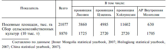 В 2006 г. в КНР был собран урожай зерновых в 442,4 млн т. Общая доля провинций северо-востока КНР и АР Внутренняя Монголия в этом урожае составила 18,5 %. Больше всего зерновых было собрано в провинции Хэйлунцзян – 26,1 млн т. Необходимо отметить, что урожайность зерновых значительно превышает таковую на юге Дальнего Востока России: в провинции Хэйлунцзян она составила 53,8 ц/га, в провинции Цзилинь – 70,7 ц/га, в провинции Ляонин – 59,3 ц/га при средней урожайности зерновых по стране в 53,2 ц/га [China statistical yearbook, 2007].