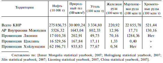 Данные приграничные территории обладают достаточно богатым природно-ресурсным потенциалом (табл. 7.1, 7.2). Провинция Хэйлунцзян – одна из наиболее богатых по запасам нефти, а Внутренняя Монголия лидирует по разведанным запасам природного газа и угля. Основные полезные ископаемые металлов сосредоточены в провинции Ляонин – она лидирует по разведанным запасам железных и марганцевых руд (табл. 7.1).