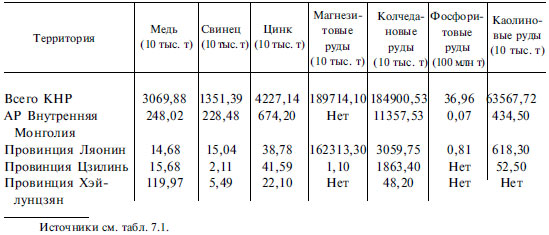 На территории Внутренней Монголии сосредоточены основные запасы меди, свинца, цинка, колчедановых руд (85,6 % разведанных запасов колчедана в КНР). Кроме того, здесь находятся крупные запасы природной соли – около 182 млн т. В провинции Хэйлунцзян расположены значительные месторождения меди.