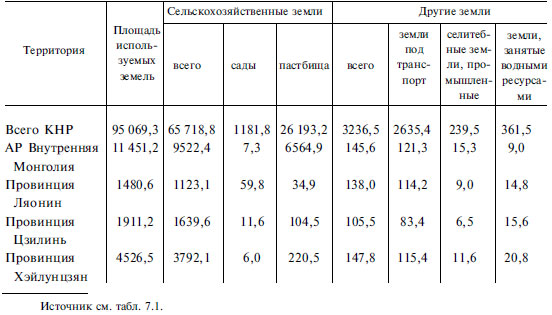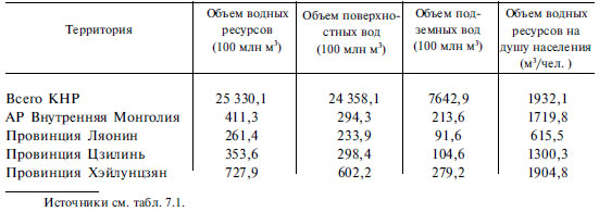 Для характеристики природно-ресурсного потенциала КНР важное значение имеют также данные об объемах водных ресурсов, площади лесов и запасах древесины, о земельных ресурсах, используемых в сельскохозяйственном производстве. В табл. 7.3 показан объем водных ресурсов приграничных с Россией районов КНР.