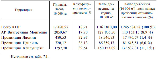 Северо-восток КНР и восточная часть Внутренней Монголии являются основными лесными районами Китая, здесь сосредоточено 28,9 % лесов и 28 % запасов древесины Китая (табл. 7.4).