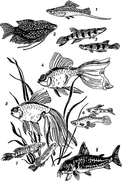 Аквариумные рыбы: 1 — меченосец; 2 — жемчужный гурами; 3 — хаплохиус Шапери; 4 — телескоп; 5 — вуалехвост; 6 — гуппи; 7 — фундулус; 8 — каллихт.