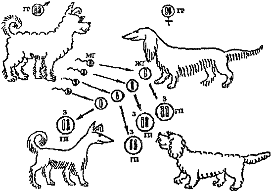 Развитие начинается с зиготы (з), образованной слиянием мужской (мг) и женской (жг) гамет; гаметы несут одинарный (гаплоидный) набор хромосом; зигота несет двойной (парный, диплоидный) набор хромосом; у потомка каждая пара хромосом составлена одной материнской и одной отцовской; разные сочетания родительских хромосом в генотипе потомков (гп) создают новые комбинации признаков, в результате дети отличаются и от родителей, и друг от друга; чем более сходен генотип родителей (гр), тем более однотипны потомки.