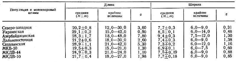 Изучая размеры аскоспор различных географических популяций, интересно отметить, что нижние крайние значения длины и ширины у всех популяций одинаковы, а именно, соответственно равны 12 и 6 мкм, причем крайние величины ширины аскоспор у трех популяций находятся в пределах б—7,5 мкм и лишь у одной немного выходят за эти рамки (Волжская — 6—9 мкм).