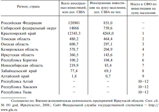 Анализ показывает, что, хотя во многих регионах, в том числе и Бурятии, имеются объективные предпосылки для привлечения иностранного капитала, богатые запасы природных ресурсов, достаточно квалифицированная и дешевая рабочая сила, а также научно-технический потенциал, привлечение иностранного капитала остается на низком уровне. Бурятия среди регионов СФО по объемам инвестиций на душу населения занимает 6-е место, а уровень инвестиций здесь ниже среднероссийского более, чем в 7 раз (табл. 11.8).