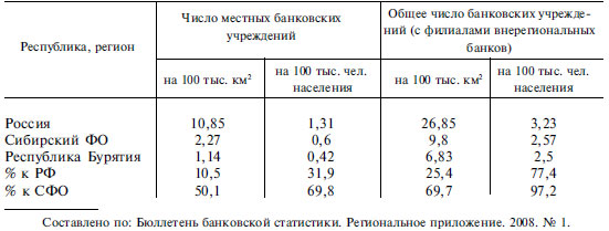 Таблица 11.9 Обеспеченность банковскими учреждениями в Республике Бурятия в сравнении с общероссийскими данными и показателями по СФО (на 01.01.2008 г.)