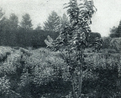 Отводковая плантация сирени на Лесостепной опытной селекционной станции. На переднем плане цветущий контрольный куст, регулярно, через определённые сроки оставляемый на цветение для проверки сортовой чистоты