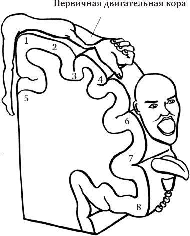 Первичная двигательная кора: 1 — бедро; 2 — туловище; 3 — рука (кроме кисти); 4 — кисть; 5 — ступня; 6 — лицо; 7 — язык; 8 — гортань