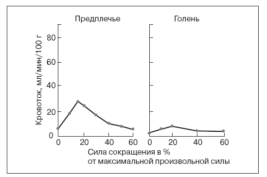 Рис. 29. Кровоснабжение мышц предплечья и голени при статической работе