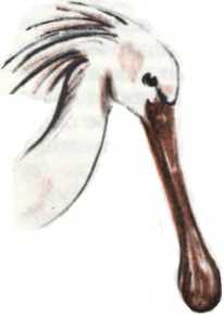 В Южной Европе и Средней Азии обитает довольно редкая птица колпица. Она похожа на цаплю, у нее такие же длинные ноги и шея, но клюв вроде теннисной ракетки. Таким клювом очень удобно хватать рыбок, лягушек и других мелких водных животных.