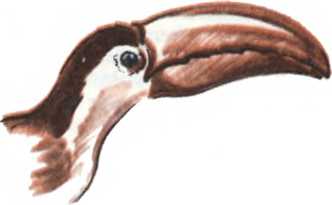 В тропических лесах Южной Америки, почти так же часто, как в наших лесах кукушку, можно встретить красивую, ярко окрашенную птицу — тукана. Главная достопримечательность тукана — клюв. Сама птица не больше гуся, а клюв у нее достигает длины тридцать сантиметров и ширины — более десяти. Казалось бы, с таким огромным клювом трудно летать. Ничуть не бывало, тукан порхает, словно жаворонок. Оказывается, клюв у него совсем легкий — верхний роговой слой очень тонкий, а внутри он пористый, как пенопласт.