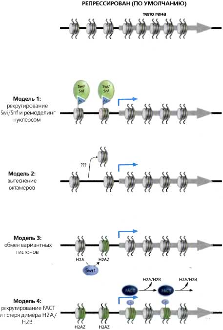 В модели 1 семейство АТФаз Swi/Snf связывается с хроматином посредством узнавания ацетилированных гистонов с помощью бромодомена и действует таким образом, чтобы изменить локальную структуру хроматина. Модель 2 изображает замещение октамера [the reported octamer eviction], происходящее в некоторых локусах, таких как РН05, с помощью неизвестного механизма. В модели 3 АТФаза SWR1 катализирует замещение гистона Н2А вариантом H2AZ. который подготавливает хроматин к транскрипции. В модели 4 делается акцент на участии FACT в транскрипционной элонгации, что способствует развертыванию [unraveling] за счет смещения димера Н2А/Н2В. Это может сопровождаться обменом гистона H3 на H3.З в ходе этого процесса