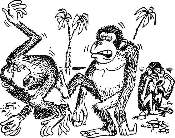 Обезьяны, которые между собой дружат, обмениваются тихим, с придыханием звуком «хон». Это призыв посидеть в обнимку, тесно прижавшись друг к другу, поискать друг у друга в шерстке, короче — желание сделать что-то приятное своему ближнему.