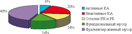 Для оценки засорённости околоземного космического пространства техногенным мусором как экскретом можно выделить несколько типов объектов искусственного происхождения. Орбитальный техногенный мусор в них различается по своему происхождению, составу и по функциональному назначению (см. Рис. 2.3.7). Надо иметь в виду, что приведённые на этом рисунке данные имеют приблизительный характер и доля отдельных компонент в общей их массе заметно меняется год от года.