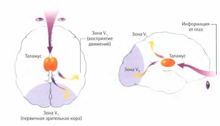 Информация от глаз поступает преимущественно в зону V1 — первичную зрительную кору, расположенную в затылочной части мозга и отвечающую за сознательное восприятие видимого мира. Другой нейронный путь, меньшего размера, ведет от глаз напрямую в зону V5, и именно он, по-видимому, позволяет некоторым слепым людям все-таки воспринимать движения. Эту разновидность слепоты называют слепозрением.