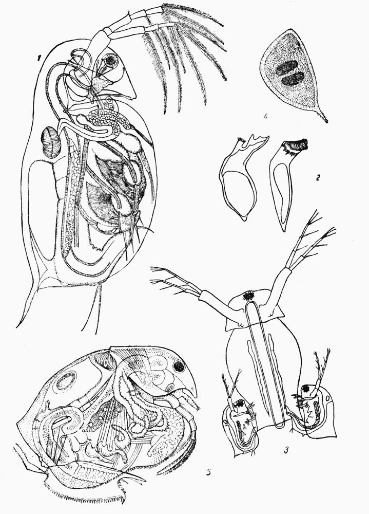 Таблица LXVII: Рис. 1. Дафния (Daphnia pulex). - Рис. 2. Мандибулы дафнии (справа,) и битотрефес. - Рис. 3. Копуляция дафнии (Daphnia magna). - Рис. 4. Эфиппиум дафнии (Daphnia magma). - Рис 5. Эурицеркус (Eurycercus lamellatus).