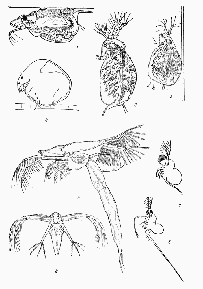 Ветвистоусые рачки очень разнообразны по внешнему виду. В небольшом пруду среда зарослей озера можно найти несколько видов, относящихся к разным семействам подотряда. К числу одной из наиболее крупных форм принадлежит симоцефалус (Simocephalus vetulus) - дафния, одетая в округлую раковину без шипа назади, достигающая 3 мм длины. Другая такая же крупная дафния (3 мм) эурицеркус (Eurycercns lamellatus, LXV1I, 5) легко узнаётся по её характерной кауде о гребешком зубчиков и глубоким вырезом на конце.
