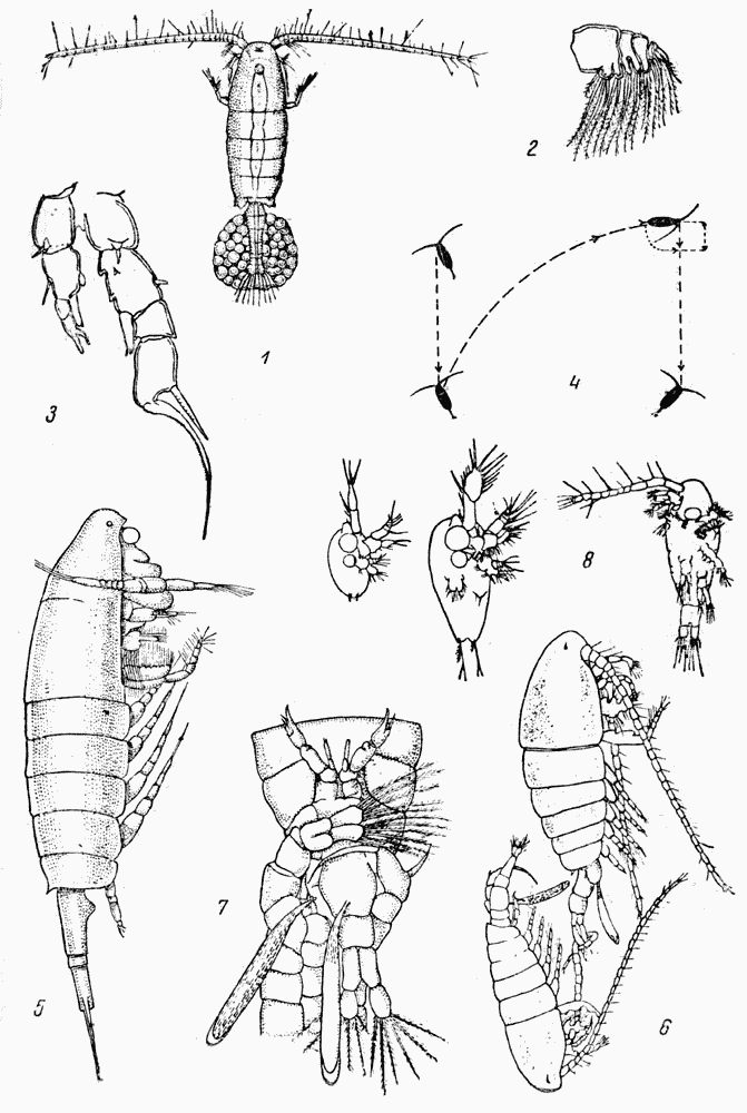 Оплодотворенные яйца при выходе из половых отверстий самки образуют округлый непарный яйцевой мешок (LXX, 1). Вскоре из яиц выходят личинки; они несколько раз линяют, проходя 6 науплиальных и 6 копеподитных стадий (LXX, 8). Последняя стадия и есть взрослый рачек.
