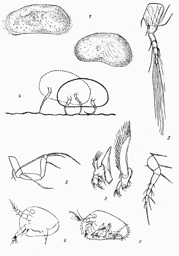 Таблица LXXI: Рис. 1. Ракушковые рачки циприс (Суpris reptans) и кандона (Candona Candida) (справа). - Рис. 2. Первая и вторая (внизу) антенны ракушкового рачка (Cypris acuteata). - Рис. 3. Жвала и максима кандоны (Candona). - Рис. 4. Функция антенны и 2-й грудной ножки при ходьбе (схема). - Рис. 5. Чистильная (3-я) ножка ракушкового рачка Candona brevicornis. - Рис. 6. Личинка первой стадии ципринотуса (Cyprinotus incoguens). - Рис. 7. Личинка 6-й стадии ципринотуса.