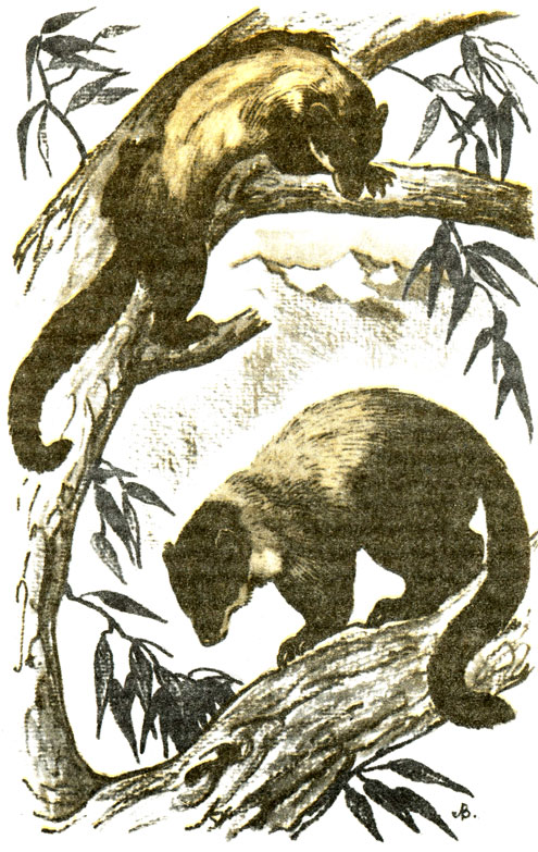 В какое-то мгновение эту тишину пронзили резкие звериные голоса, послышался шум быстро приближающихся животных. Через минуту на поляну, буквально под ноги, выскочили 2 крупные харзы и слились в ярко-пестрый мечущийся клубок, из которого летели клочья шерсти; обе остервенело кричали. Драка была настолько свирепой, что я подумал: кто-то из них, конечно, погибнет. Я попытался спугнуть их своим криком — никакого внимания. Только третья харза, которую я, видимо, сразу не заметил, метнулась в лес, и я решил, что это самцы дерутся из-за самки.