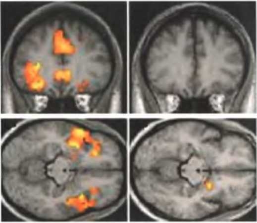 Томограммы головного мозга психопатов заставляют предположить, что их поведение может быть отчасти связано с нарушениями работы миндалины. Когда ряд страшных фотографий, изображающих сцены насилия, показывают здоровому человеку, его миндалина бурно реагирует на это (слева), в то время как у психопата демонстрация тех же фотографий не вызывает почти никакого отклика (справа).