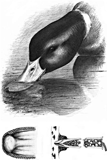 Немецкие анатомы XIX века первыми увидели механорецепторы кончика утиного клюва. Существует два типа таких рецепторов. Более крупные и сложнее устроенные были открыты Эрнстом Фридрихом Густавом Гербстом (1803–1893) и названы в его честь; он обнаружил их в 1848 году в костной ткани, затем, в 1849-м, – на птичьем нёбе, в 1850-м – в коже и в 1851-м – на языке птицы. Тельца Гербста, чувствительные к давлению, а значит, и к прикосновениям, представляют собой овальные образования длиной около 150 мкм и шириной 120 мкм (один микрометр – одна тысячная часть миллиметра), но иногда достигают в длину одного миллиметра. Механорецепторы второго типа, тельца Грандри, названные в честь бельгийского биолога М. Грандри, который впервые обнаружил их в 1869 году, меньше размерами (около 50 мкм в длину и 50 мкм в ширину) и проще устроены; они чувствительны к движению. Рецепторы обоих типов содержатся вместе в коническом теле сосочка, причем тельца Грандри меньшего размера размещены над тельцами Гербста и образуют очень красивую конструкцию.