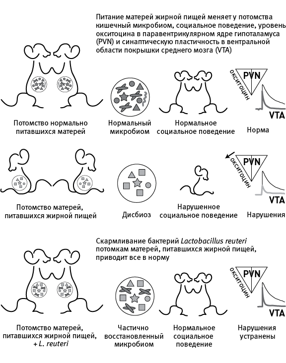 Метагеномный анализ выявил несколько видов кишечных бактерий, численность которых высока у контрольных мышей, но резко понижена у потомков перекормленных матерей. Сильнее всего (на порядок) сократилась численность бактерии Lactobacillus reuteri. Ранее было показано, что присутствие L. reuteri влияет на выработку окситоцина (Poutahidis et al., 2013). Таким образом, начал прорисовываться возможный механизм влияния микробиоты на социальное поведение: жирная диета снижает численность L. reuteri у матерей и их потомства, что ведет к снижению производства окситоцина в мозге и, как следствие, к асоциальности.
