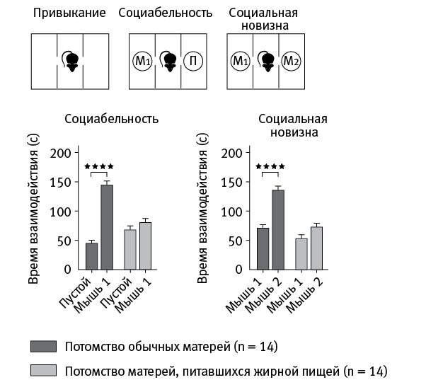 Также известно, что диета матери может влиять на неврологические и поведенческие характеристики потомства. В частности, у людей вероятность расстройств аутистического спектра повышается в полтора-два раза, если мать во время беременности имеет избыточный вес (Krakowiak et al., 2012). Ранее было показано, что у мышей некоторые симптомы, характерные для аутизма (тревожность, стереотипные движения), можно ослабить, добавляя в пищу кишечную бактерию Bacteroides fragilis. Впрочем, на социальное поведение мышей и их интерес к общению с сородичами эта процедура не влияет (Hsiao et al., 2013). Но так или иначе, позволительно предположить, что связь между ожирением матери и аутизмом у потомства опосредуется изменениями кишечной микробиоты.