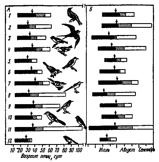 Начало темной полосы — возраст и сроки, к которому большинство птенцов вылетают из гнезда. Конец темной, заштрихованной и светлой полос указывает, к какому моменту из района рождения исчезает 70, 90 и 100 % особей из числа пойманных в большие ловушки птиц. Стрелка указывает уход 50 % особей. 1 — вертишейка, 2 — деревенская ласточка, 3 — мухоловка-пеструшка, 4 — весничка, 5 — зеленая пересмешка, 6 — ястребиная славка, 7 — славка-завирушка, 8 — белая трясогузка, 9 — лесной конек, 10 — сорокопут-жулан, 11 — зяблик, 12 — обыкновенная чечевица.