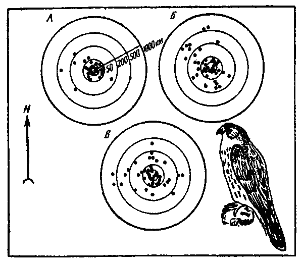 Хищные птицы (орлы, канюки, луни, ястреба и сокола) расселяются в первое свое лето в пределах нескольких десятков километров от родного гнезда. Например, канюки, окольцованные птенцами в ГДР, в июле встречаются уже в пределах 40 км. от места вылупления. В августе из 37 встреч окольцованных птиц 6 особей обнаружены на расстоянии свыше 50 км. от гнезд, самая отдаленная встреча была зарегистрирована в 172 км. У пустельги окольцованные молодые птицы в июне и июле встречаются преимущественно в пределах 20 км. от места рождения (рис. 18), хотя отдельные особи были обнаружены на расстоянии нескольких сот километров (до 400). В августе они расселяются еще дальше. Отдельные особи зарегистрированы на расстоянии 400–600 км. от родного гнезда.