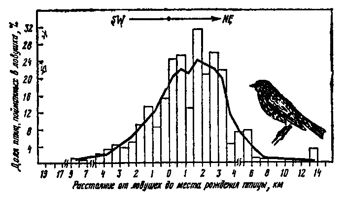 Однако у других перелетных видов расселение молодых птиц идет в разных направлениях, как это часто наблюдается у оседлых видов. Например, у зяблика на Куршской косе молодые птицы в июле расселяются примерно в равной степени к северо-востоку и юго-западу от места рождения (рис. 20). Зяблики зимуют главным образом во Франции и Испании, поэтому, вероятно, тенденция двигаться в сторону зимовки у молодых птиц появляется несколько позже, чем у дальних мигрантов. Правда, в южной Англии обнаружено, что у дальнего мигранта — веснички, зимующей в Экваториальной Африке, расселение молодых в июле идет в разных направлениях. Миграция на юго-восток начинается преимущественно в августе, после окончания линьки.