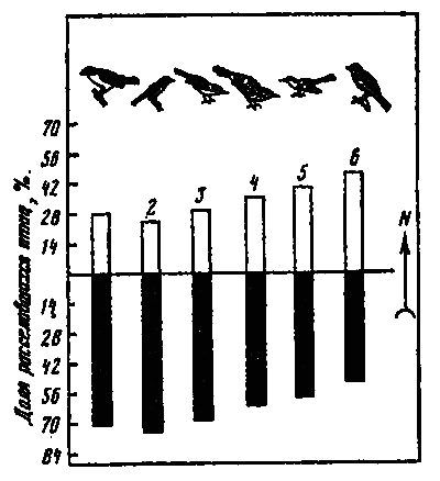Темная часть столбика — местные старые особи, гнездившиеся в предыдущие годы; заштрихованная часть — местные, впервые гнездящиеся годовалые и двухлетние особи; светлая часть — иммигранты впервые гнездящиеся. Цифры — доля особей (%).