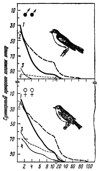 Анализ 274 поимок окольцованных птенцами мухоловок-пеструшек в стационарные ловушки в послегнездовой период на Куршской косе показал, что молодые птицы расселяются преимущественно в пределах 6 км. от места рождения (рис. 19). Около 10 % особей были пойманы на расстоянии от 6 до 13 км. Сходные данные по послегнездовому расселению молодых мухоловок получены и в других частях ареала — в Карелии (А. В. Артемьевым и В. И. Голованем) и Голландии (Дж. Баленом).