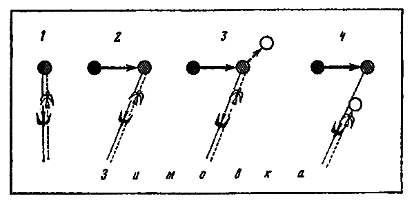 1 — возвращение птиц для гнездования непосредственно в район рождения (темный кружок), 2 — возвращение в район, куда птица расселилась в послегнездовой период (заштрихованный кружок), 3 — вынужденное выселение птицы весной после возвращения с зимовки в новый район (светлый кружок), 4 — оседание птицы при возвращении домой в новом районе.