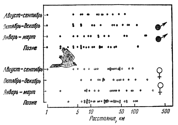 А. А. Кищинский сообщает, что зимняки, родившиеся в горах на юге Норвегии, были обнаружены (3 возврата) половозрелыми в период гнездования на расстоянии более 1000 км. Он приходит к выводу, что эти впечатляющие случаи «абмиграций» у зимняка свидетельствуют о том, что «перемешивание» населения и межпопуляционный обмен особями у этого вида, вероятно, обычные явления. Они связаны, по его мнению, со значительными локальными колебаниями численности северных полевок, составляющих летнюю кормовую базу зимняка. В противоположность зимняку у близкого к нему вида — канюка, половозрелые особи в Восточной Европе приступают к размножению преимущественно в пределах 50 км. от места вылупления. Только несколько особей обнаружены достаточно далеко от родины (в 134, 327 и 554 км. к юго-западу от места рождения). Анализируя данные Х. Пернера по дальности и направленности расселения пустельги в ГДР, приходишь к выводу о большом сходстве масштабов расселения птиц после вылета из гнезда и при первом их гнездовании (см. рис. 18).