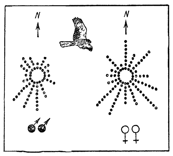 Исследуя ориентационное поведение в специальных круглых клетках с восемью регистрирующими жердочками у молодых полевых и домовых воробьев, а также у пухляка, мы обнаружили, что птицы способны к компасной ориентации, т. е. поддержанию выбранного направления относительно стран света, несмотря на то что они не могли увидеть из клетки никаких ориентиров, кроме солнца. Каждая птица предпочитала прыгать в выбранном направлении, несмотря на систематические повороты круглой клетки (чтобы исключить влияние внутренних ориентиров клетки). Для реализации двигательной активности птицы выбирали разные направления. Я высказал предположение, что обнаруженная способность оседлых видов к компасной ориентации играет важную роль при их расселении. Без способности поддерживать выбранное направление хотя бы на протяжении нескольких дней птице, вероятно, трудно покинуть район рождения и расселиться на достаточно большое расстояние. На способность молодых птиц в процессе дисперсии придерживаться какого-то определенного направления на протяжении нескольких дней указывают и другие исследователи.