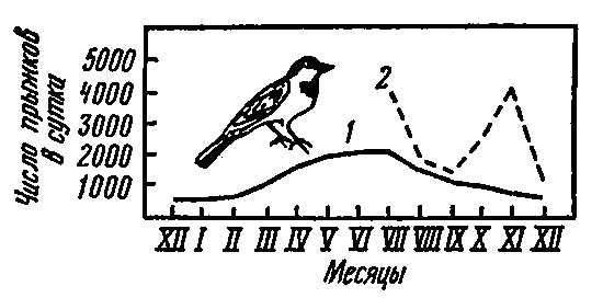 Рис. 25. Уровень двигательной активности в клетке у взрослых (1) в молодых (2) полевых воробьев в разные сезоны года.