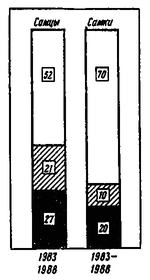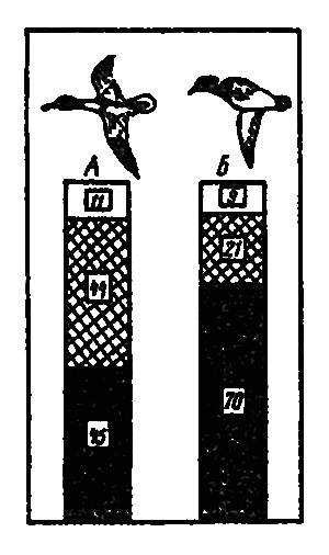 На оз. Энгурес латвийские орнитологи на протяжении многих лет кольцуют и отлавливают взрослых самок и утят. Ежегодно кольцуется более 80 % утят широконоски и хохлатой чернети. В результате массового кольцевания утят и по мере вымирания старых птиц неизвестного происхождения на оз. Энгурес установился достаточно стабильный высокий уровень численности самок местного происхождения, что дало возможность определить средний процент местных самок в популяции. Авторы пришли к выводу, что у широконоски местные самки составляют около 90 %, а самки-иммигранты — 10 % (рис. 26). Среди местных самок молодые особи (годовалые и двухлетние) занимали примерно половину. У хохлатой чернети самки-иммигранты тоже составляют около 10 % среди гнездящихся птиц. Доля молодых птиц (примерно 20 %) среди местных гнездящихся самок чернети была меньше, чем у широконоски. Эти данные характеризуют лишь средний состав изучаемых популяций уток. В разные годы соотношение местных молодых самок и самок-иммигрантов значительно колеблется в зависимости от уровня смертности уток различного возраста, плотности гнездовой популяции и погодных условий в местах зимовки.