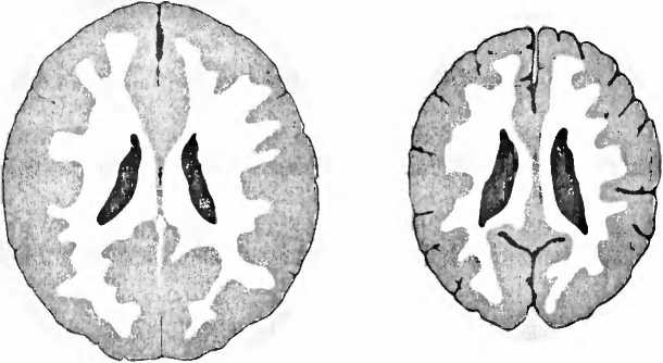Рис. 6. Справа — томограмма мозга сильно запущенного трехлетнего ребенка, и для сравнения — томограмма мозга ребенка такого же возраста с нормальным развитием мозга (слева). У запущенного ребенка мозг значительно меньше, с увеличенными желудочками вентрикулами, полостями, черного цвета), по сравнению с мозгом нормально развивавшегося ребенка того же возраста. Кроме того между мозговыми извилинами видны увеличенные пространства из-за сморщивания (атрофии) коры больших полушарий (В. D. Perry, 2002).