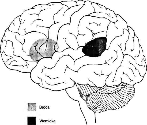 Рис. 7. Речевые центры Брока (лобный, владение речью) и Вернике (височный, понимание речи). Эти центры также тесно связаны с восприятием музыки и пения. Музыка и речь очень близки друг к другу.