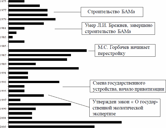 Количество и характер публикаций ВСП, посвященных экологической тематике, в течение почти 30-летнего периода (с 1975–2003 гг.) изменялся (рис. 4) в зависимости от социально-экономических и политических изменений в жизни нашей страны, а также изменений законодательной природоохранной базы и роста экологического сознания общества.