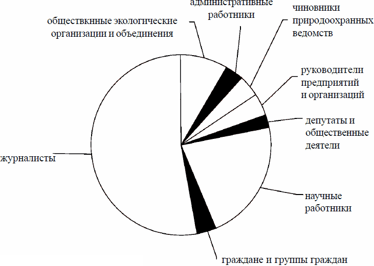 Третье место по числу публикаций принадлежит членам общественных экологических организаций и независимой экологической экспертизы. Совсем небольшую долю занимают заметки и статьи граждан – читателей ВСП. Пока непонятно, чем это явление объясняется – действительно низкой активностью этих групп или политикой «Восточки».